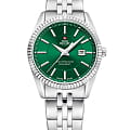 Кварцевый механизм с высокой точностью. Минеральное стеклоМинеральное стеклоМинеральное стекло представляет собой искусственно выращенный минерал кварца. Такое стекло отличается особой устойчивостью к повреждениям и царапинам. Уступает по некоторым качествам сапфировому стеклу. устойчивое к появлению царапин, обладающее высокой прозрачностью. Стрелки с люминесцентным покрытиемЛюминесцентное покрытиеПозволяет считывать показания времени в темноте. Производители наносят на стрелки, часовые индексы, безель или поверхность циферблата светонакопительный состав, дающий холодное свечение.. Класс водозащиты: 50 метров, позволит защитить корпус от случайных брызг или капель дождя. Корпус часов изготовлен из нержавеющей стали. Браслет с застёжкой «бабочка» с кнопкамиЗастёжка "бабочка"Такой вид застёжки дополняется предохранителями, помогающими избежать случайного раскрытия браслета. Обладают изящным исполнением. .
