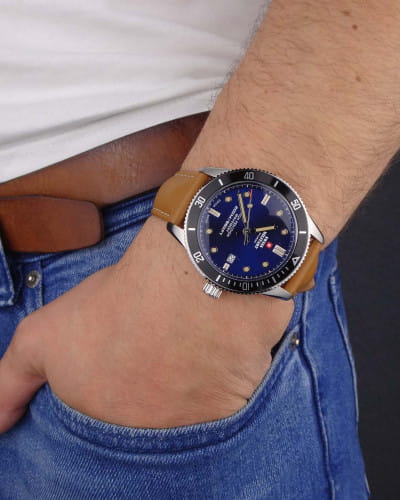 Кварцевый механизм с высокой точностью. Минеральное стеклоМинеральное стеклоМинеральное стекло представляет собой искусственно выращенный минерал кварца. Такое стекло отличается особой устойчивостью к повреждениям и царапинам. Уступает по некоторым качествам сапфировому стеклу. устойчивое к появлению царапин, обладающее высокой прозрачностью. Стрелки с люминесцентным покрытиемЛюминесцентное покрытиеПозволяет считывать показания времени в темноте. Производители наносят на стрелки, часовые индексы, безель или поверхность циферблата светонакопительный состав, дающий холодное свечение.. БезельБезельВнешний ободок, закрепляющий стекло. В спортивных часах так называется поворотное кольцо с делениями на циферблате, выполняет роль таймера – замеряет отрезки времени на шкале. Неподвижный безель – элемент декора. Однонаправленно вращающийся безель на дайверских часах позволяет фиксировать моменты погружения и выныривания на поверхность. вращающийся с PVD-покрытиемPVDУльтратонкое покрытие наносится в технике вакуумного напыления, сочетает в себе нитрид титана особой прочности со слоем золота или оксида хрома. Несёт в себе декоративную или защитную функцию.. Класс водозащиты: 200 метров, позволит плавать, нырять и заниматься другими водными видами спорта. Корпус часов изготовлен из нержавеющей стали. Кожаный ремешок с классической застежкой.