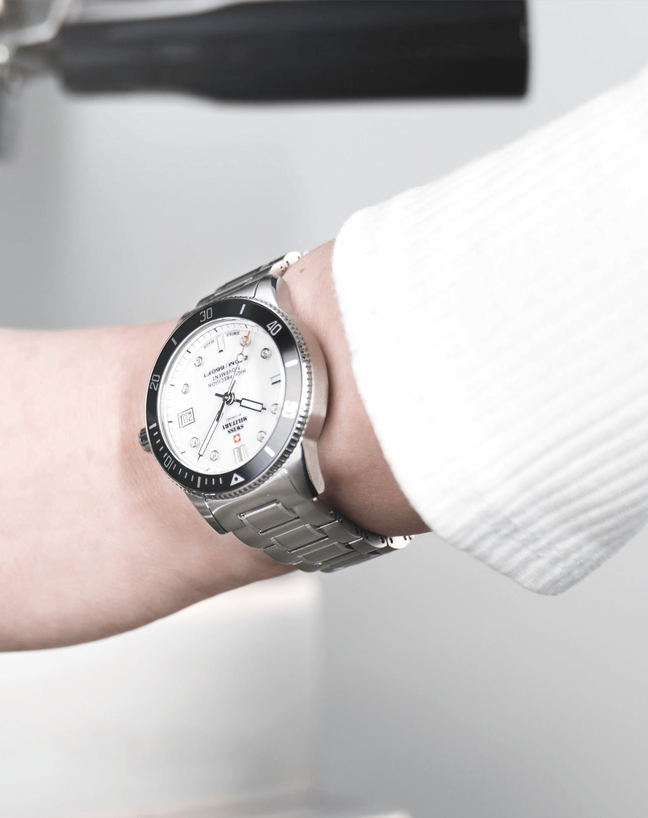 Кварцевый механизм с высокой точностью. Минеральное стеклоМинеральное стеклоМинеральное стекло представляет собой искусственно выращенный минерал кварца. Такое стекло отличается особой устойчивостью к повреждениям и царапинам. Уступает по некоторым качествам сапфировому стеклу. устойчивое к появлению царапин, обладающее высокой прозрачностью. Стрелки с люминесцентным покрытиемЛюминесцентное покрытиеПозволяет считывать показания времени в темноте. Производители наносят на стрелки, часовые индексы, безель или поверхность циферблата светонакопительный состав, дающий холодное свечение.. БезельБезельВнешний ободок, закрепляющий стекло. В спортивных часах так называется поворотное кольцо с делениями на циферблате, выполняет роль таймера – замеряет отрезки времени на шкале. Неподвижный безель – элемент декора. Однонаправленно вращающийся безель на дайверских часах позволяет фиксировать моменты погружения и выныривания на поверхность. вращающийся с PVD-покрытиемPVDУльтратонкое покрытие наносится в технике вакуумного напыления, сочетает в себе нитрид титана особой прочности со слоем золота или оксида хрома. Несёт в себе декоративную или защитную функцию.. Индексы украшены кристаллами. Класс водозащиты: 200 метров, позволит плавать, нырять и заниматься другими водными видами спорта. Корпус часов изготовлен из нержавеющей стали. Браслет с раскладной застёжкойРаскладная застёжкаТакой тип застёжки используется только на браслетах из металла. Она никогда не раскрывается полностью, происходит разделение на 2 и более частей. Раскладывающая застёжка снизит вероятность потери часов к минимуму..
