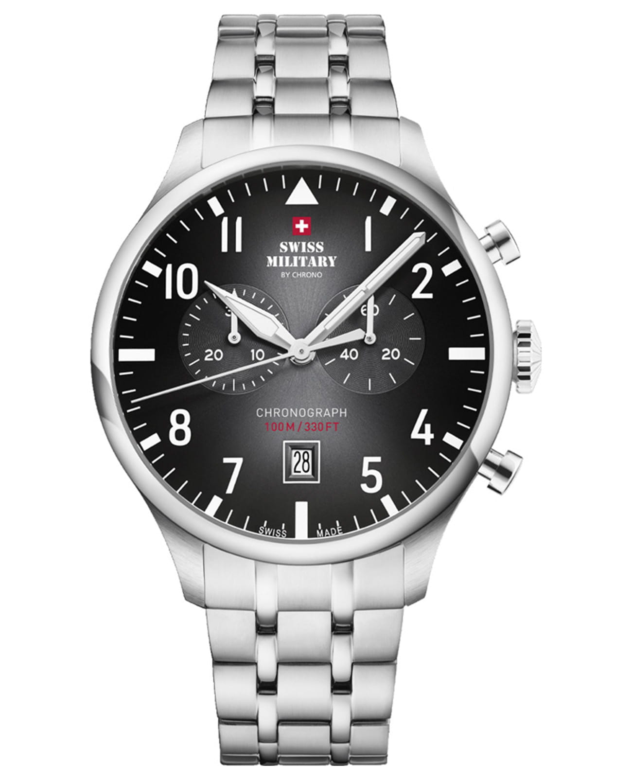 Мужские швейцарские часы хронографХронографФункция позволяет измерять отрезки времени с особой точностью: часы, минуты, секунды. Верным признаком хронографа является наличие на циферблате 3 дополнительных окошек-счётчиков. с секундомеромСекундомерСекундоме́р — прибор, способный измерять интервалы времени с точностью до долей секунды. Swiss Military by Chrono Vintage Chronograph SM34098.01, кварцевый механизм с высокой точностью. Cапфировое стеклоСапфировое стеклоПрочный и надёжный материал из кристалла сапфира синтетического происхождения, характеризующийся особой твёрдостью и устойчивостью к царапинам и повреждениям. устойчивое к появлению царапин и обладающее высокой прозрачностью. Корпус часов изготовлен из нержавеющей стали. На циферблате расположены два дополнительных индикатора и окошко даты. Окошко даты находится в положении 6 часов. Стрелки с люминесцентным покрытиемЛюминесцентное покрытиеПозволяет считывать показания времени в темноте. Производители наносят на стрелки, часовые индексы, безель или поверхность циферблата светонакопительный состав, дающий холодное свечение.. Класс водозащиты: 100 метров, позволит плавать, нырять и заниматься другими водными видами спорта. Стальной браслет на раскладной застёжкеРаскладная застёжкаТакой тип застёжки используется только на браслетах из металла. Она никогда не раскрывается полностью, происходит разделение на 2 и более частей. Раскладывающая застёжка снизит вероятность потери часов к минимуму..