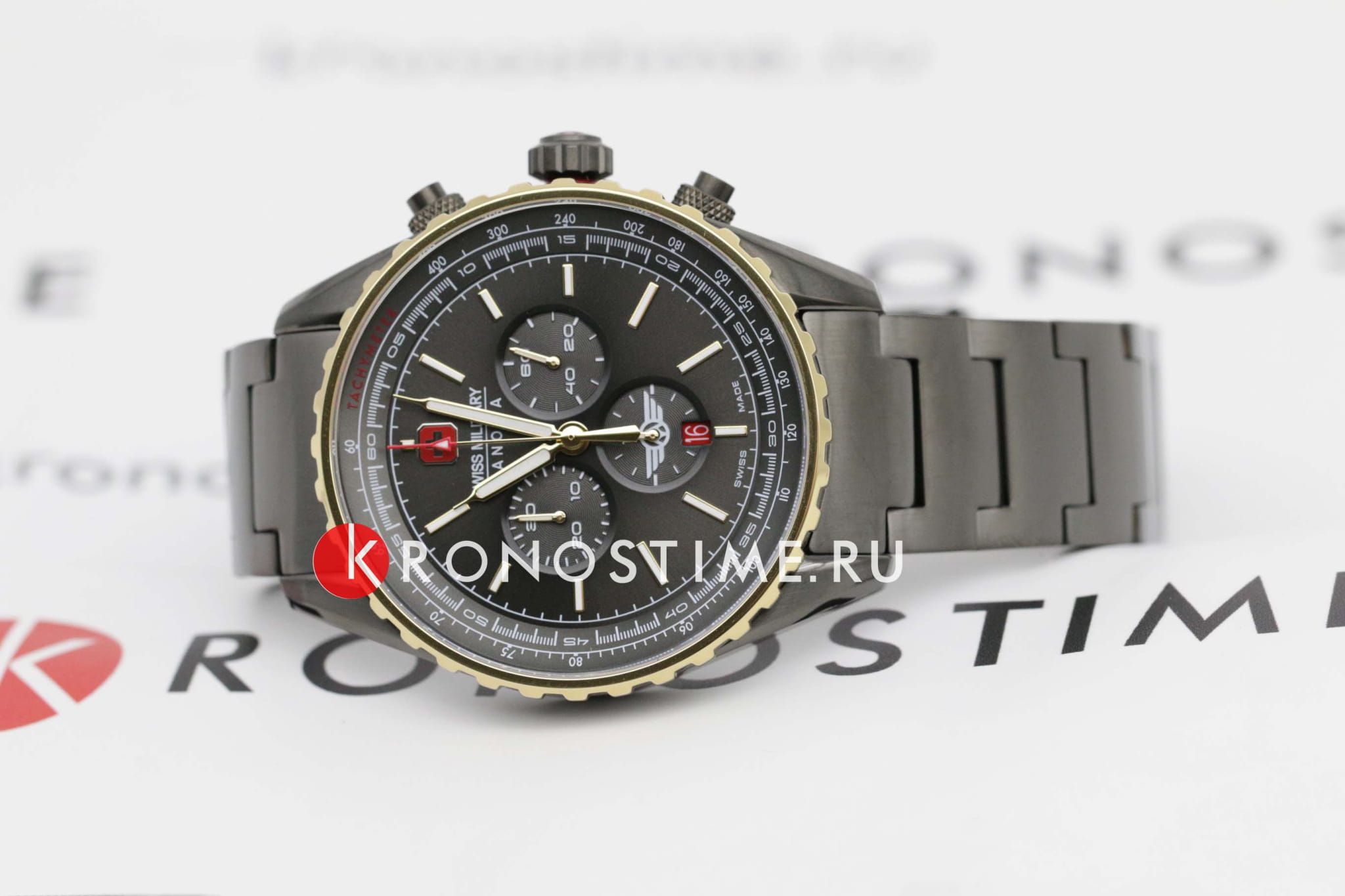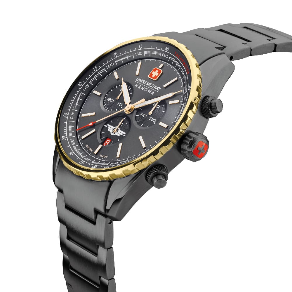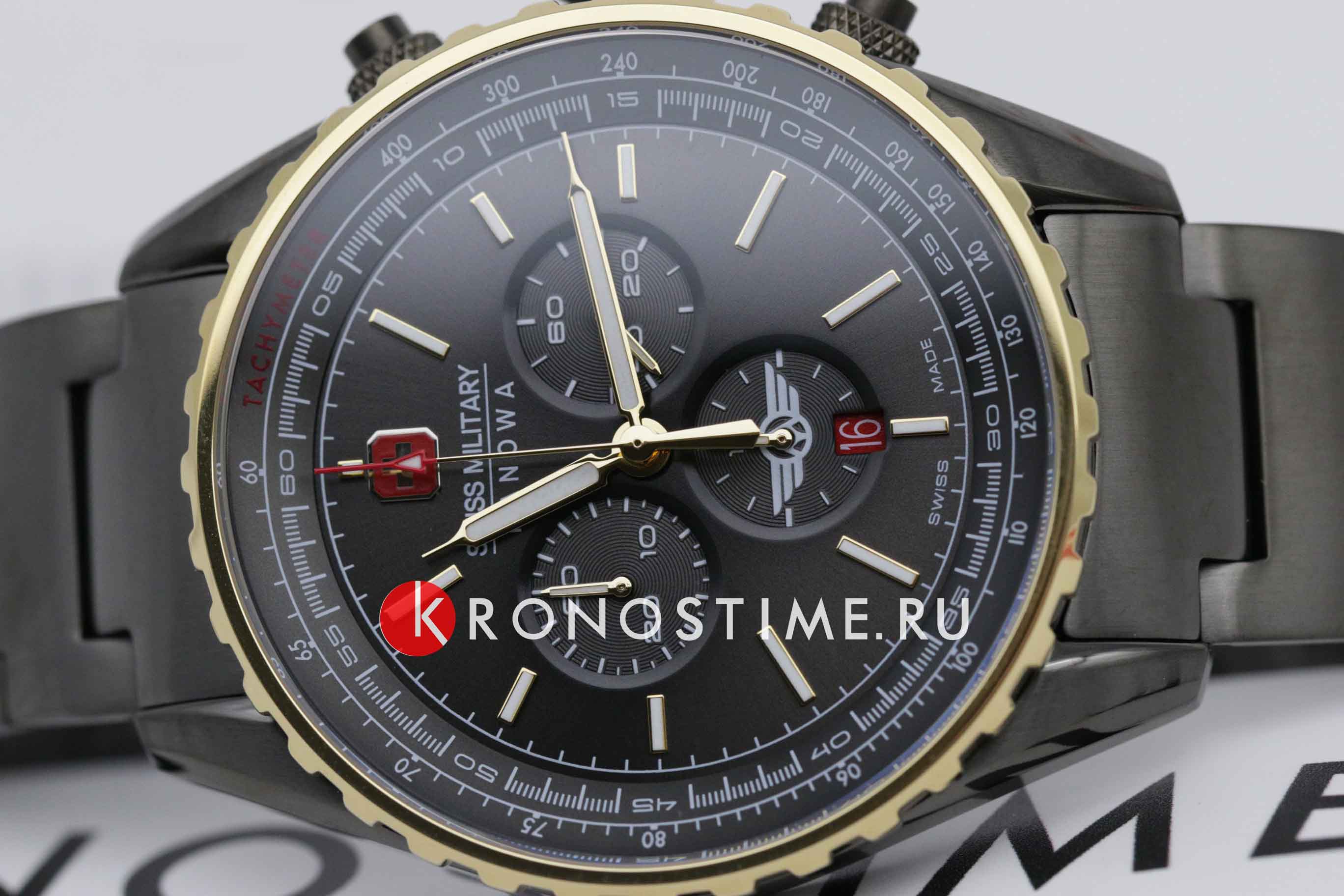 Мужские швейцарские часы c хронографомХронографФункция позволяет измерять отрезки времени с особой точностью: часы, минуты, секунды. Верным признаком хронографа является наличие на циферблате 3 дополнительных окошек-счётчиков. Swiss Military Hanowa SMWGI0000341, кварцевый механизм с высокой точностью. Сапфировое стеклоСапфировое стеклоПрочный и надёжный материал из кристалла сапфира синтетического происхождения, характеризующийся особой твёрдостью и устойчивостью к царапинам и повреждениям. устойчивое к появлению царапин, обладающее высокой прозрачностью. Класс водозащиты: 100 метров, позволит плавать, нырять и заниматься другими водными видами спорта. Корпус и браслет часов изготовлены из стали с IP-покрытиемIP-покрытиеМетод ионного напыления. Демонстрирует повышенную устойчивость к истиранию, окислению и химическим веществам. Под воздействием высокого давления и температуры около 1500°C молекулы металла надёжно соединяются с частицами корпуса часов.. Индикация даты. ТахиметрТахиметрРазмеченная шкала, располагается на ободке или безеле часов. Тахиметр позволяет рассчитать скорость на определённом участке пути, расстояние измеряется в километрах или милях.. Черный циферблат с часовыми индексами в виде штрихов. Стрелки и метки с люминесцентным покрытиемЛюминесцентное покрытиеПозволяет считывать показания времени в темноте. Производители наносят на стрелки, часовые индексы, безель или поверхность циферблата светонакопительный состав, дающий холодное свечение..