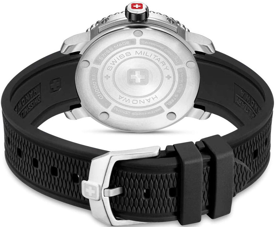 Мужские швейцарские часы Swiss Military Hanowa SMWGN0001701, кварцевый механизм с высокой точностью. Сапфировое стеклоСапфировое стеклоПрочный и надёжный материал из кристалла сапфира синтетического происхождения, характеризующийся особой твёрдостью и устойчивостью к царапинам и повреждениям. устойчивое к появлению царапин, обладающее высокой прозрачностью. Корпус часов изготовлен из стали. Стрелки с люминесцентным покрытиемЛюминесцентное покрытиеПозволяет считывать показания времени в темноте. Производители наносят на стрелки, часовые индексы, безель или поверхность циферблата светонакопительный состав, дающий холодное свечение.. Окошко даты в положении 6 часов. Класс водозащиты: 200 метров, позволит плавать, нырять и заниматься другими водными видами спорта. Силиконовый ремешок на стандартной застежке.