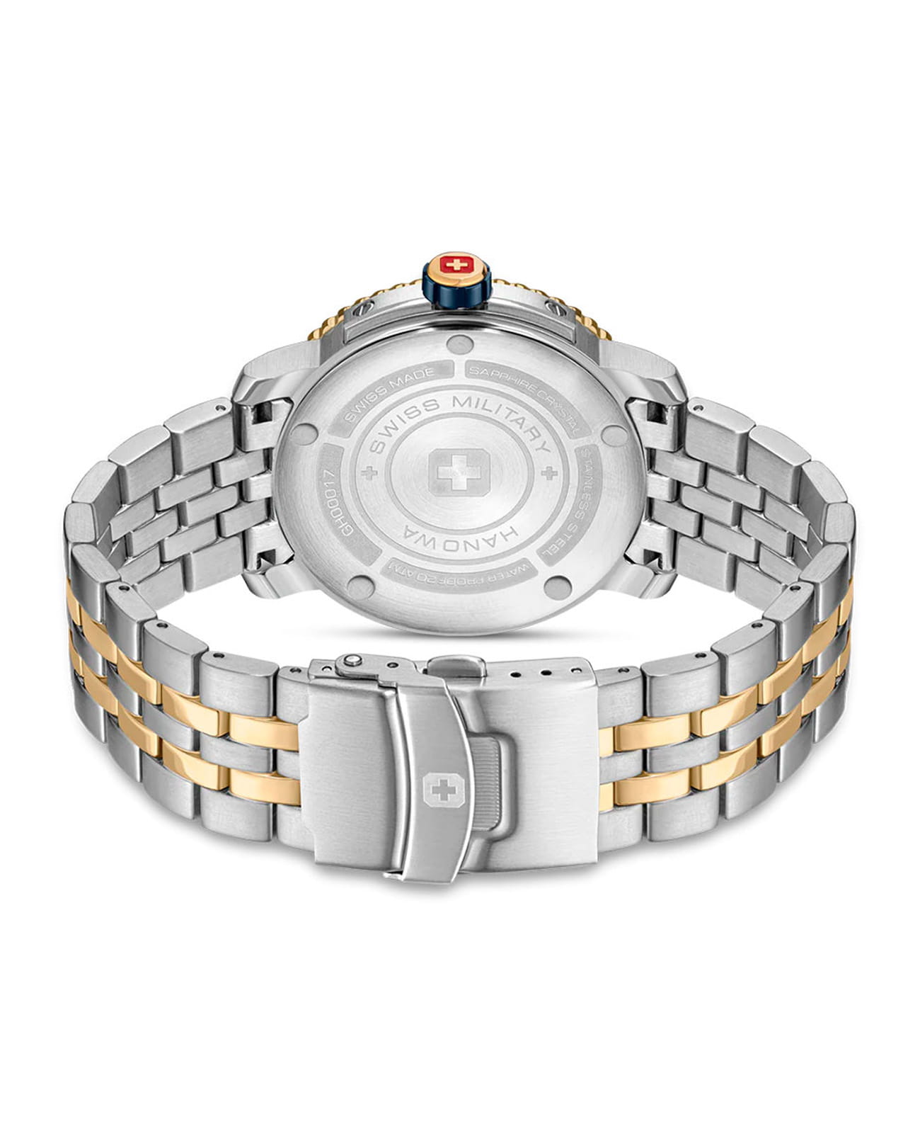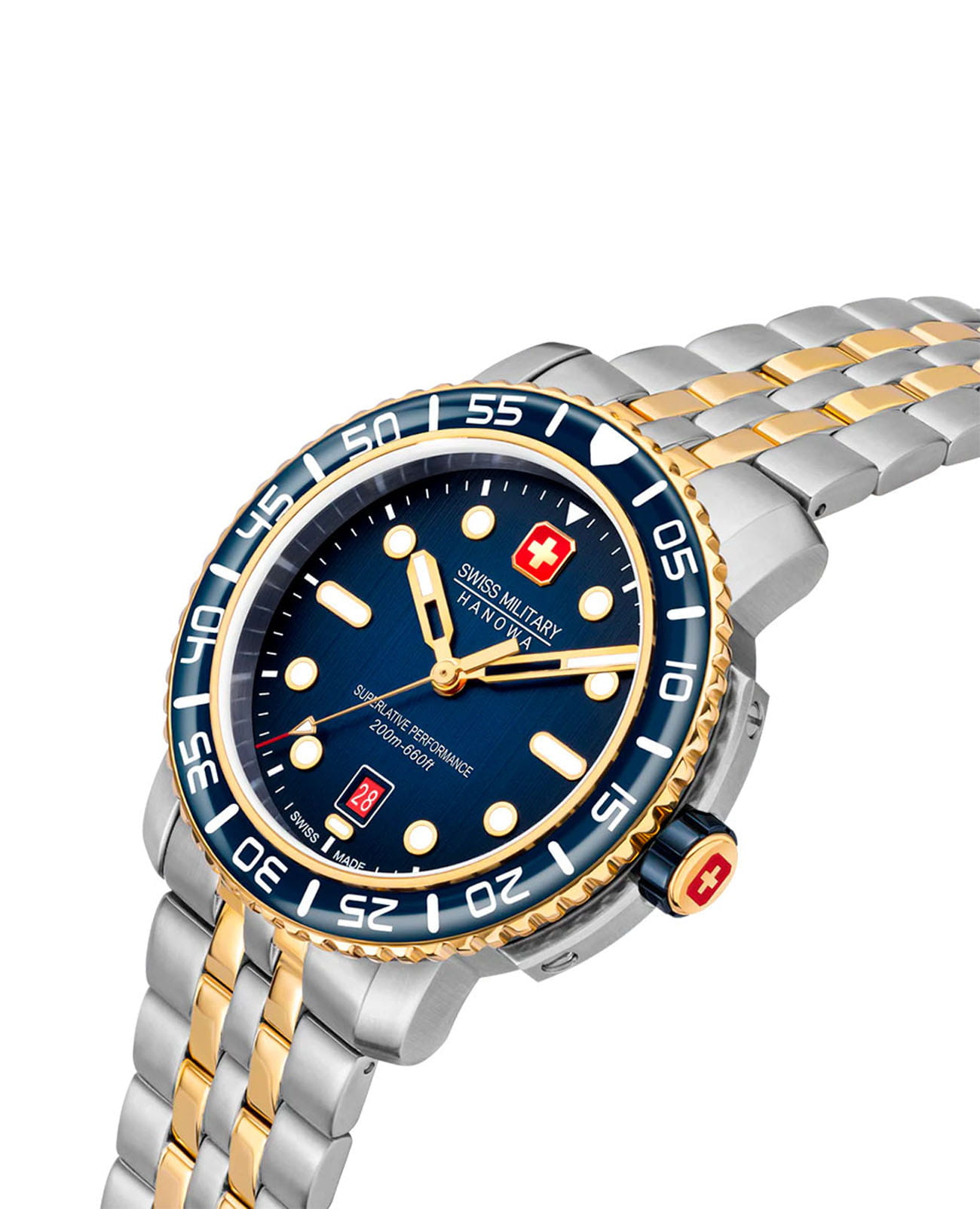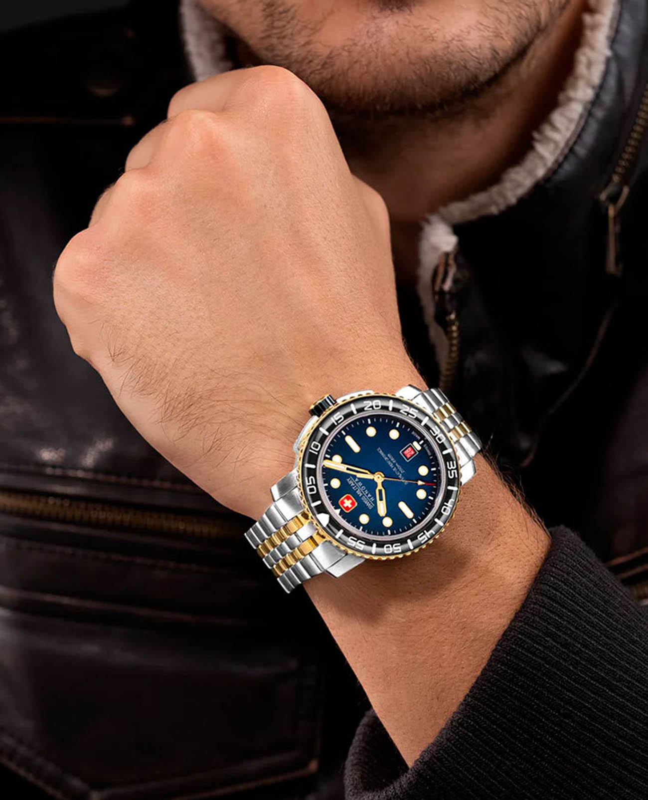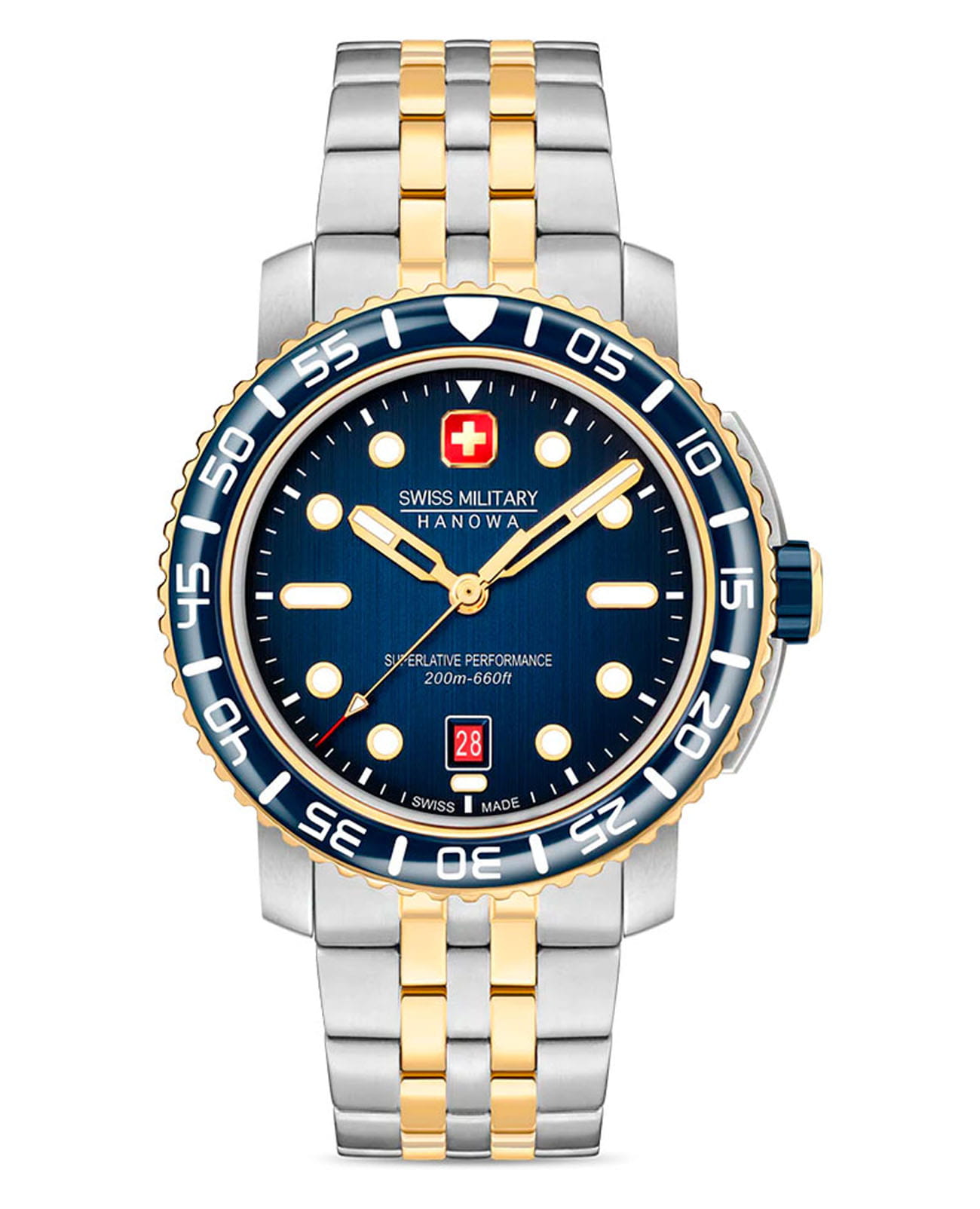 Мужские швейцарские часы с сапфировым стекломСапфировое стеклоПрочный и надёжный материал из кристалла сапфира синтетического происхождения, характеризующийся особой твёрдостью и устойчивостью к царапинам и повреждениям. Swiss Military Hanowa Black Marlin SMWGH0001760, кварцевый механизм с высокой точностью. Сапфировое стеклоСапфировое стеклоПрочный и надёжный материал из кристалла сапфира синтетического происхождения, характеризующийся особой твёрдостью и устойчивостью к царапинам и повреждениям. устойчивое к появлению царапин, обладающее высокой прозрачностью. Корпус часов изготовлен из стали. Вращающийся безельБезельВнешний ободок, закрепляющий стекло. В спортивных часах так называется поворотное кольцо с делениями на циферблате, выполняет роль таймера – замеряет отрезки времени на шкале. Неподвижный безель – элемент декора. Однонаправленно вращающийся безель на дайверских часах позволяет фиксировать моменты погружения и выныривания на поверхность. из стали PVD-покрытиемPVDУльтратонкое покрытие наносится в технике вакуумного напыления, сочетает в себе нитрид титана особой прочности со слоем золота или оксида хрома. Несёт в себе декоративную или защитную функцию. и керамики. Центральные часовая и минутная стрелки, секундная стрелка вынесена на малый циферблат. Окошко даты находится в положении 6 часов. Стрелки и метки с люминесцентным покрытиемЛюминесцентное покрытиеПозволяет считывать показания времени в темноте. Производители наносят на стрелки, часовые индексы, безель или поверхность циферблата светонакопительный состав, дающий холодное свечение.. Класс водозащиты: 200 метров, позволит плавать, нырять и заниматься другими водными видами спорта. Стальной браслет с частичным PVD-покрытиемPVDУльтратонкое покрытие наносится в технике вакуумного напыления, сочетает в себе нитрид титана особой прочности со слоем золота или оксида хрома. Несёт в себе декоративную или защитную функцию.на раскладной застёжкеРаскладная застёжкаТакой тип застёжки используется только на браслетах из металла. Она никогда не раскрывается полностью, происходит разделение на 2 и более частей. Раскладывающая застёжка снизит вероятность потери часов к минимуму..