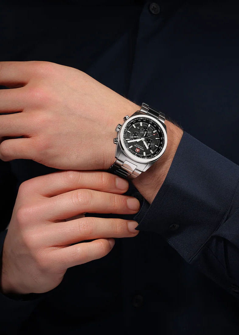 Мужские швейцарские часы Swiss Military Hanowa SMWGI0004204 – это элегантные часы, сочетающие в себе классический дизайн и современную функциональность. Корпус из нержавеющей стали диаметром 43 мм сбалансирован и элегантен. Сапфировое стеклоСапфировое стеклоПрочный и надёжный материал из кристалла сапфира синтетического происхождения, характеризующийся особой твёрдостью и устойчивостью к царапинам и повреждениям. с антибликовым покрытием защищает циферблат от царапин и обеспечивает отличную читаемость при любом освещении. Браслет с раскладной застёжкойРаскладная застёжкаТакой тип застёжки используется только на браслетах из металла. Она никогда не раскрывается полностью, происходит разделение на 2 и более частей. Раскладывающая застёжка снизит вероятность потери часов к минимуму. идеально дополняют дизайн часов, обеспечивая комфортное ношение. Люминесцентное покрытиеЛюминесцентное покрытиеПозволяет считывать показания времени в темноте. Производители наносят на стрелки, часовые индексы, безель или поверхность циферблата светонакопительный состав, дающий холодное свечение. стрелок и меток позволит вам следить за временем даже в полной темноте. Циферблат с точным механизмом хронографаХронографФункция позволяет измерять отрезки времени с особой точностью: часы, минуты, секунды. Верным признаком хронографа является наличие на циферблате 3 дополнительных окошек-счётчиков. и хорошо заметным индикатором даты в положении между 4 и 5 часов. ТахиметрТахиметрРазмеченная шкала, располагается на ободке или безеле часов. Тахиметр позволяет рассчитать скорость на определённом участке пути, расстояние измеряется в километрах или милях. по внешнему краю. Водонепроницаемость до 100 метров хорошо подходят для повседневного ношения и занятий водными видами спорта.
