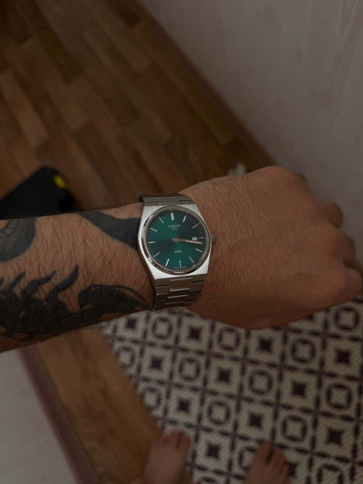 Tissot PRX 40mm (модель T137.410.11.091.00) – элегантные мужские часы, сочетающие современный стиль с передовыми технологиями. Корпус диаметром 40 мм выполнен из нержавеющей стали 316L, что обеспечивает надёжность и долговечность. Зелёный циферблат с эффектом солнечных лучей защищён сапфировым стекломСапфировое стеклоПрочный и надёжный материал из кристалла сапфира синтетического происхождения, характеризующийся особой твёрдостью и устойчивостью к царапинам и повреждениям., устойчивым к царапинам.