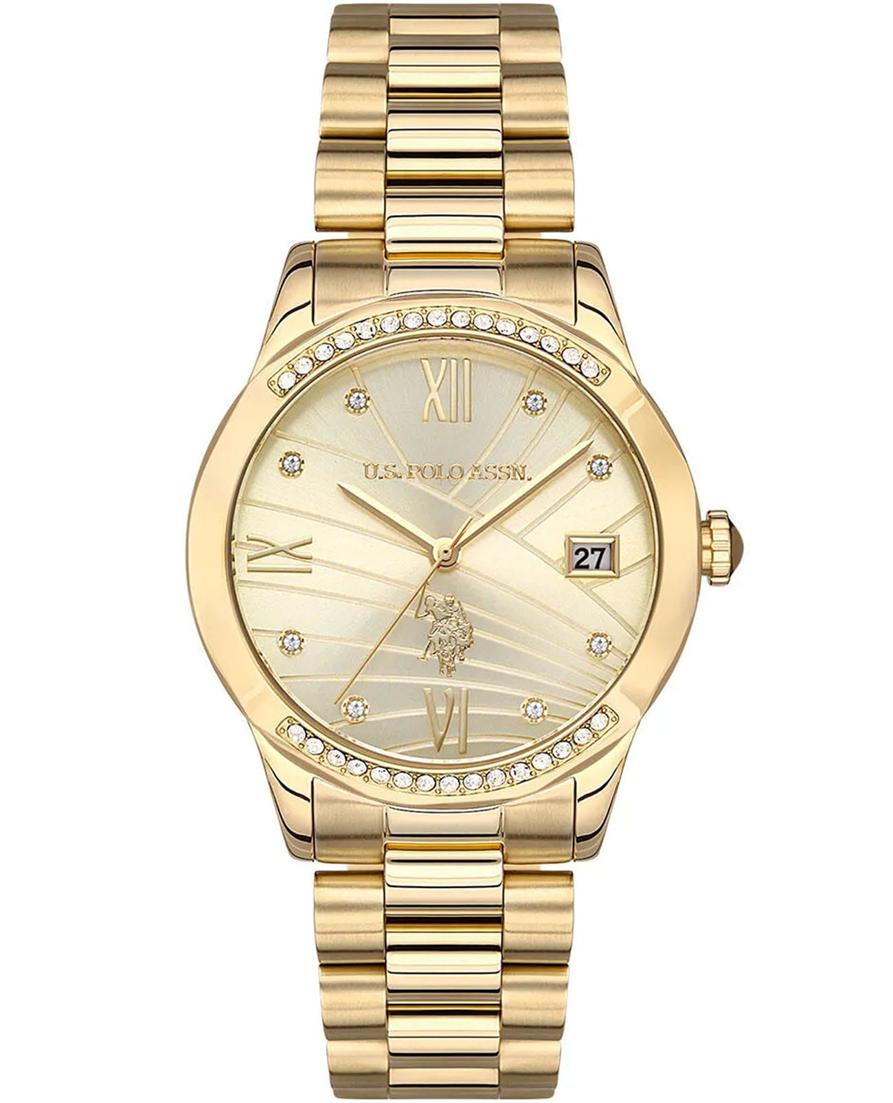 Женские элегантные часы U.S. Polo Assn. Stile USPA2059-06, кварцевый механизм с высокой точностью. Минеральное стеклоМинеральное стеклоМинеральное стекло представляет собой искусственно выращенный минерал кварца. Такое стекло отличается особой устойчивостью к повреждениям и царапинам. Уступает по некоторым качествам сапфировому стеклу. устойчивое к появлению царапин, обладающее высокой прозрачностью. Изысканный корпус изготовлен из нержавеющей стали с IP-покрытиемIP-покрытиеМетод ионного напыления. Демонстрирует повышенную устойчивость к истиранию, окислению и химическим веществам. Под воздействием высокого давления и температуры около 1500°C молекулы металла надёжно соединяются с частицами корпуса часов., а безельБезельВнешний ободок, закрепляющий стекло. В спортивных часах так называется поворотное кольцо с делениями на циферблате, выполняет роль таймера – замеряет отрезки времени на шкале. Неподвижный безель – элемент декора. Однонаправленно вращающийся безель на дайверских часах позволяет фиксировать моменты погружения и выныривания на поверхность. и циферблат украшены кристаллами. Лаконичные золотистые центральные часовая, минутная и секундная стрелки. Класс водозащиты: 50 метров, позволит защитить корпус от случайных брызг или капель дождя. Стальной браслет с IP-покрытиемIP-покрытиеМетод ионного напыления. Демонстрирует повышенную устойчивость к истиранию, окислению и химическим веществам. Под воздействием высокого давления и температуры около 1500°C молекулы металла надёжно соединяются с частицами корпуса часов. на застёжке-бабочкеЗастёжка "бабочка"Такой вид застёжки дополняется предохранителями, помогающими избежать случайного раскрытия браслета. Обладают изящным исполнением. обеспечивает комфорт и удобство в использовании, добавляя завершающий штрих к этому стильному аксессуару. Окошко даты находится в положении 3 часов. Циферблат подчёркивает изысканный характер часов, создавая универсальный образ, подходящий как для повседневных ситуаций, так и для особых случаев.