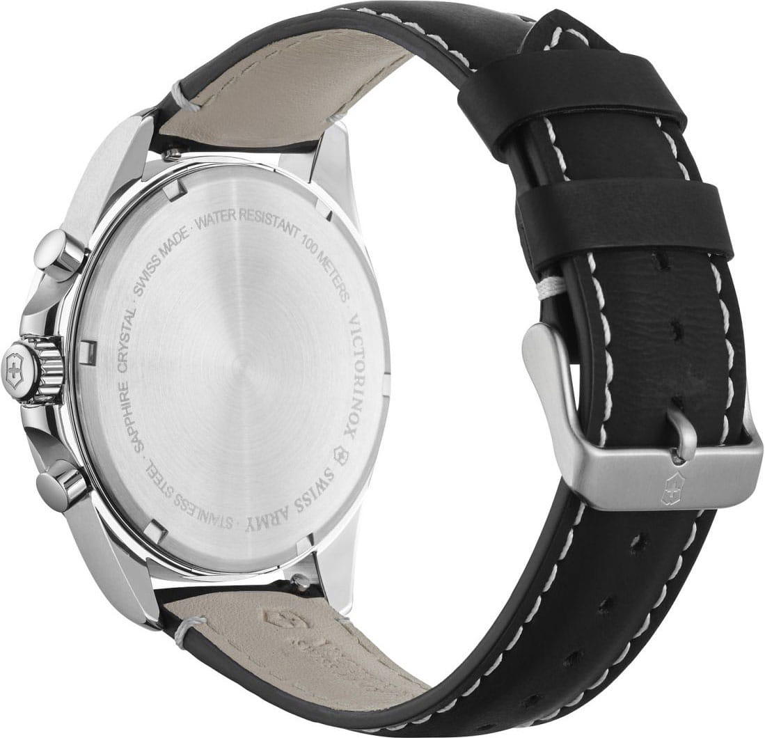 Мужские швейцарские часы-хронографХронографФункция позволяет измерять отрезки времени с особой точностью: часы, минуты, секунды. Верным признаком хронографа является наличие на циферблате 3 дополнительных окошек-счётчиков. Victorinox Fieldforce Chronograph 241852 с надёжным кварцевым механизмом. Сапфировое стеклоСапфировое стеклоПрочный и надёжный материал из кристалла сапфира синтетического происхождения, характеризующийся особой твёрдостью и устойчивостью к царапинам и повреждениям. с трёхслойным антибликовым покрытием. Корпус часов выполнен из стали с PVD-покрытиемPVDУльтратонкое покрытие наносится в технике вакуумного напыления, сочетает в себе нитрид титана особой прочности со слоем золота или оксида хрома. Несёт в себе декоративную или защитную функцию.. Практичный кожаный ремешок на стандартной застёжке. Влагозащита: 100 метров, позволит плавать, нырять и заниматься другими водными видами спорта. Окошко даты находится в положении 6 часов, стрелки и метки с люминесцентным покрытиемЛюминесцентное покрытиеПозволяет считывать показания времени в темноте. Производители наносят на стрелки, часовые индексы, безель или поверхность циферблата светонакопительный состав, дающий холодное свечение., тахиметрТахиметрРазмеченная шкала, располагается на ободке или безеле часов. Тахиметр позволяет рассчитать скорость на определённом участке пути, расстояние измеряется в километрах или милях..