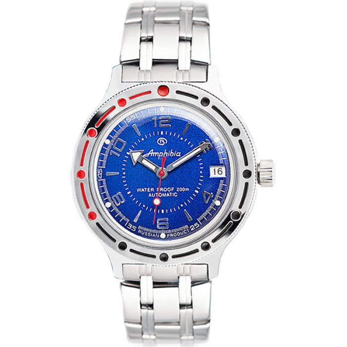 Эти практичные часы великолепно сидят на руке и позволят вам чувствовать себя уверенно в любой обстановке. Амфибия Классика. В механизме 31 камень, частота 19800 полуколебаний в час. Запас хода 31 час. Противоударное устройство оси баланса. Браслет с раскладывающейся застежкой.