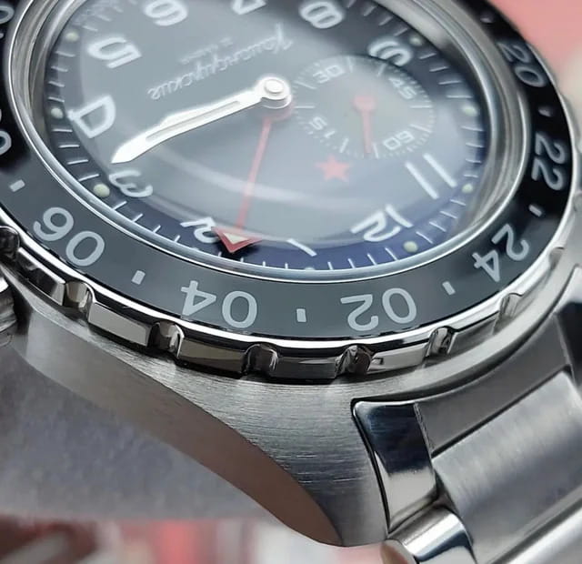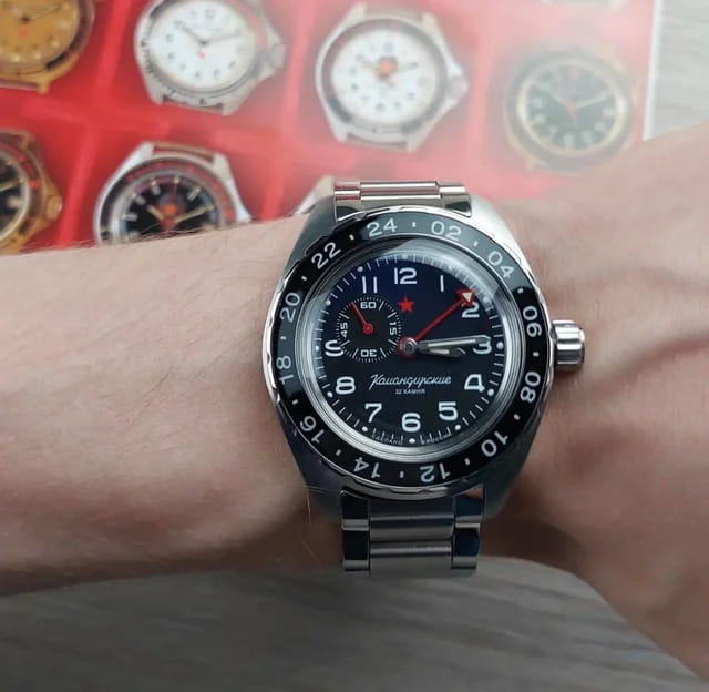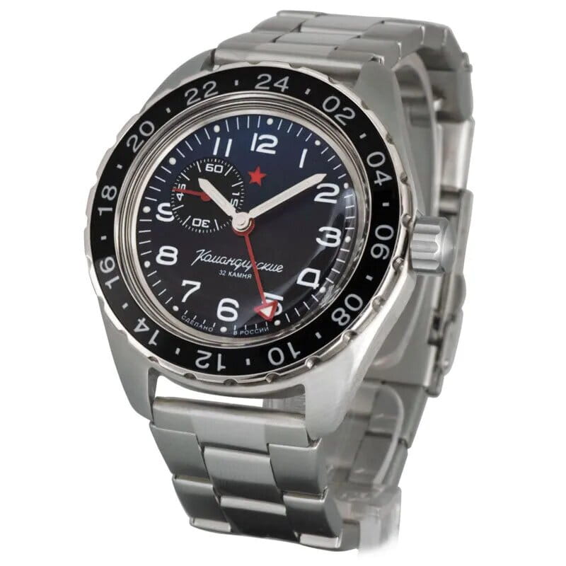 Мужские российские механические наручные часы Восток Командирские 02018А, механический механизм (автоматический калибр) с высокой точностью. Класс водозащиты: 200 метров, позволит плавать, нырять и заниматься другими водными видами спорта. Стрелки с люминесцентным покрытиемЛюминесцентное покрытиеПозволяет считывать показания времени в темноте. Производители наносят на стрелки, часовые индексы, безель или поверхность циферблата светонакопительный состав, дающий холодное свечение.. Вращающийся безельБезельВнешний ободок, закрепляющий стекло. В спортивных часах так называется поворотное кольцо с делениями на циферблате, выполняет роль таймера – замеряет отрезки времени на шкале. Неподвижный безель – элемент декора. Однонаправленно вращающийся безель на дайверских часах позволяет фиксировать моменты погружения и выныривания на поверхность. из нержавеющей стали с PVDPVDУльтратонкое покрытие наносится в технике вакуумного напыления, сочетает в себе нитрид титана особой прочности со слоем золота или оксида хрома. Несёт в себе декоративную или защитную функцию. покрытием. Дополнительная 24-часовая стрелка. Механизм калибра 24 мм с боковой секундной стрелкой. Автоподзавод с предохранительным устройством от перезаводки пружины. Частота: 19800 полуколебаний/час. Браслет с раскладной застёжкойРаскладная застёжкаТакой тип застёжки используется только на браслетах из металла. Она никогда не раскрывается полностью, происходит разделение на 2 и более частей. Раскладывающая застёжка снизит вероятность потери часов к минимуму..