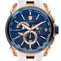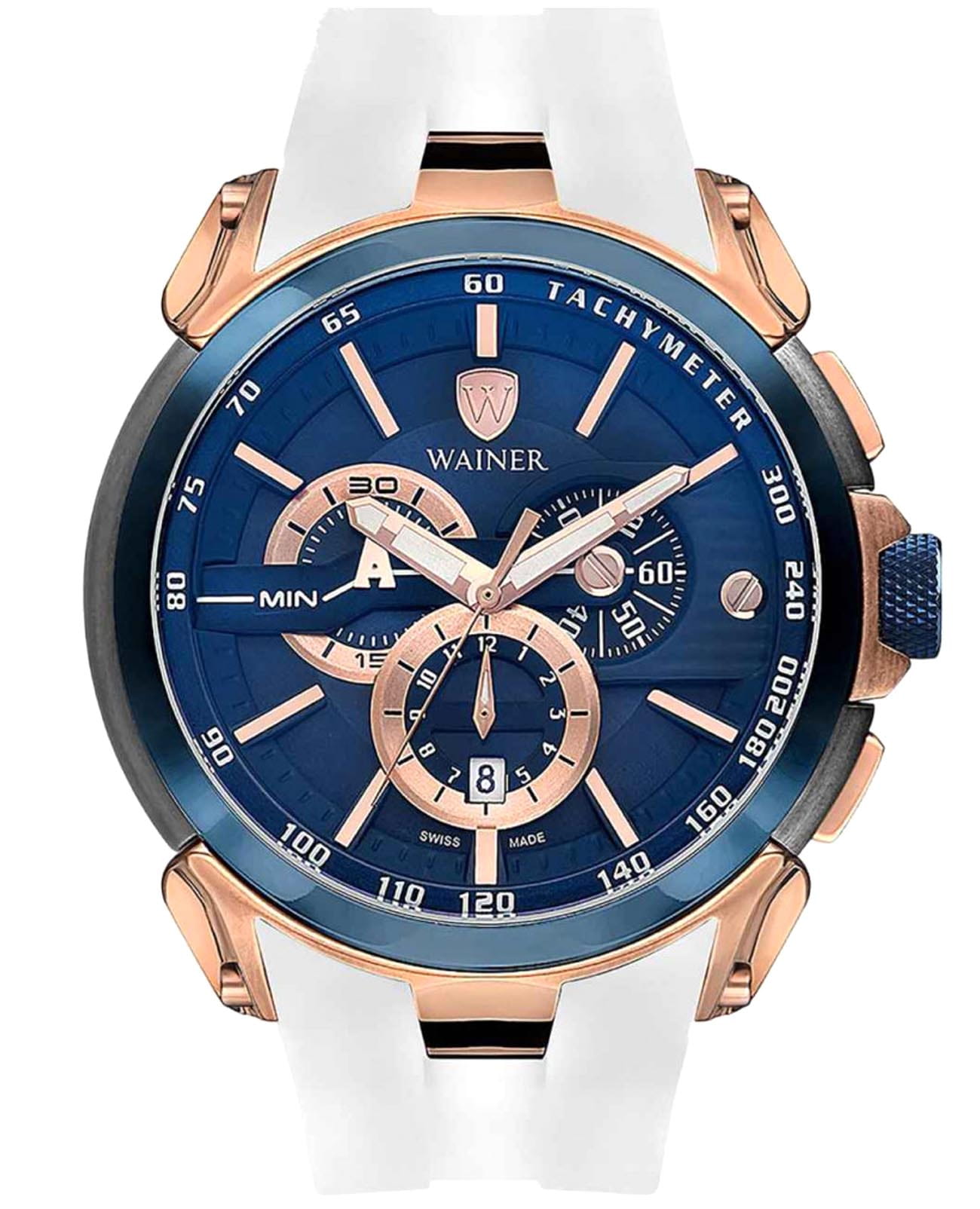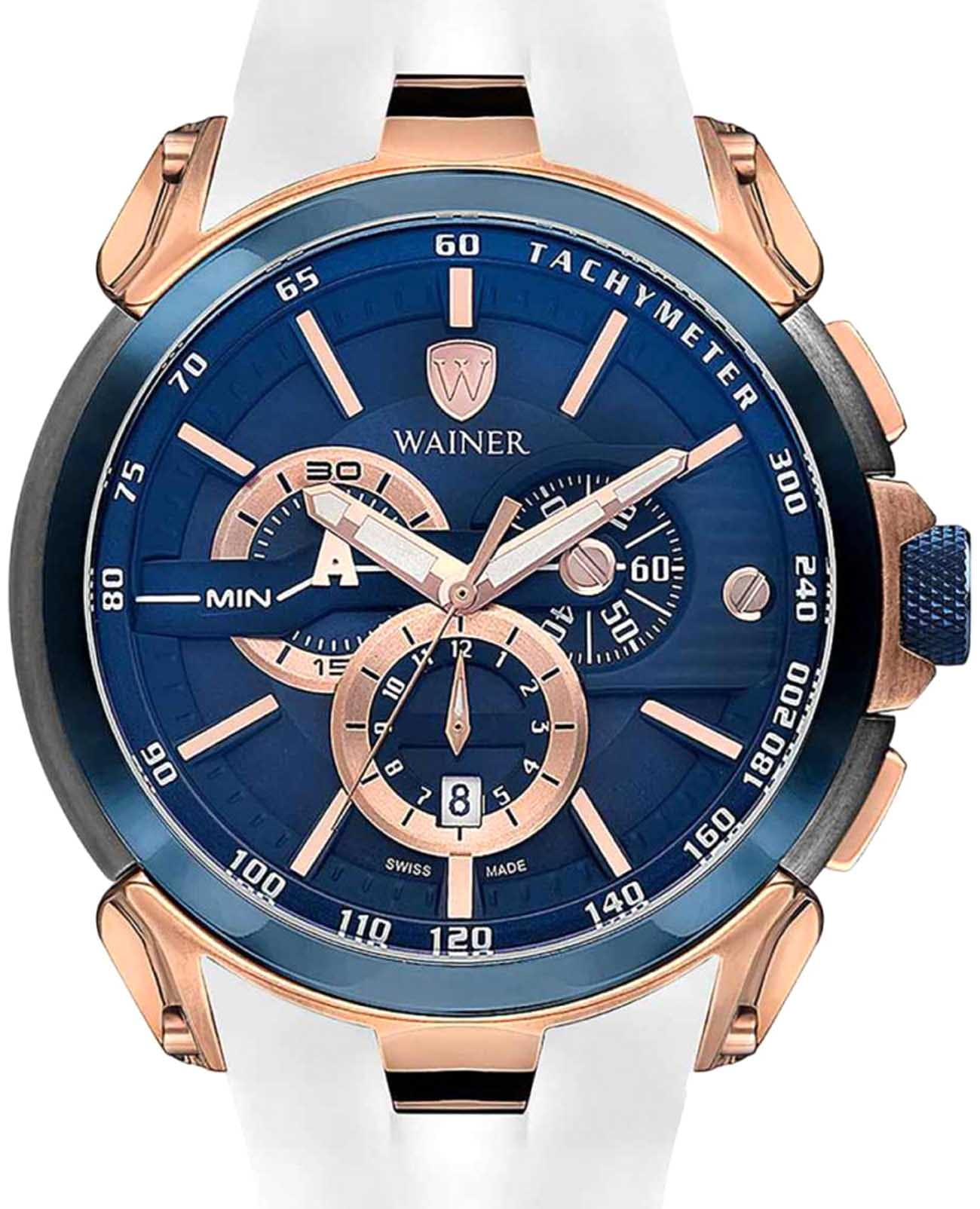 Мужские кварцевые часы-хронографХронографФункция позволяет измерять отрезки времени с особой точностью: часы, минуты, секунды. Верным признаком хронографа является наличие на циферблате 3 дополнительных окошек-счётчиков. с секундомеромСекундомерСекундоме́р — прибор, способный измерять интервалы времени с точностью до долей секунды. Wainer WA.16910-H сочетает элегантный дизайн и высокое качество исполнения. Корпус выполнен из нержавеющей стали с PVD-покрытиемPVDУльтратонкое покрытие наносится в технике вакуумного напыления, сочетает в себе нитрид титана особой прочности со слоем золота или оксида хрома. Несёт в себе декоративную или защитную функцию. цвета розового золота, диаметром 47 мм и толщиной 13 мм, обеспечивает прочность и долговечность. Циферблат с метками в виде штрихов выполнен по технологии Sunray (солнечные лучи) и украшен фирменным логотипом Wainer и дополнен тахиметромТахиметрРазмеченная шкала, располагается на ободке или безеле часов. Тахиметр позволяет рассчитать скорость на определённом участке пути, расстояние измеряется в километрах или милях.. Сапфировое стеклоСапфировое стеклоПрочный и надёжный материал из кристалла сапфира синтетического происхождения, характеризующийся особой твёрдостью и устойчивостью к царапинам и повреждениям. защищает дисплей от царапин и механических повреждений. Окошко даты находится в положении 6 часов. Стрелки с люминесцентным покрытиемЛюминесцентное покрытиеПозволяет считывать показания времени в темноте. Производители наносят на стрелки, часовые индексы, безель или поверхность циферблата светонакопительный состав, дающий холодное свечение., улучшая читаемость в условиях недостаточного освещения. БезельБезельВнешний ободок, закрепляющий стекло. В спортивных часах так называется поворотное кольцо с делениями на циферблате, выполняет роль таймера – замеряет отрезки времени на шкале. Неподвижный безель – элемент декора. Однонаправленно вращающийся безель на дайверских часах позволяет фиксировать моменты погружения и выныривания на поверхность. с PVD-покрытиемPVDУльтратонкое покрытие наносится в технике вакуумного напыления, сочетает в себе нитрид титана особой прочности со слоем золота или оксида хрома. Несёт в себе декоративную или защитную функцию. синего цвета. Силиконовый ремешок на стандартной застёжке обеспечивает комфортное ношение. Водонепроницаемость до 100 метров делает модель подходящей для плавания и активного образа жизни. Wainer — это стильный и надежный аксессуар для тех, кто ценит швейцарское качество и современные технологии.